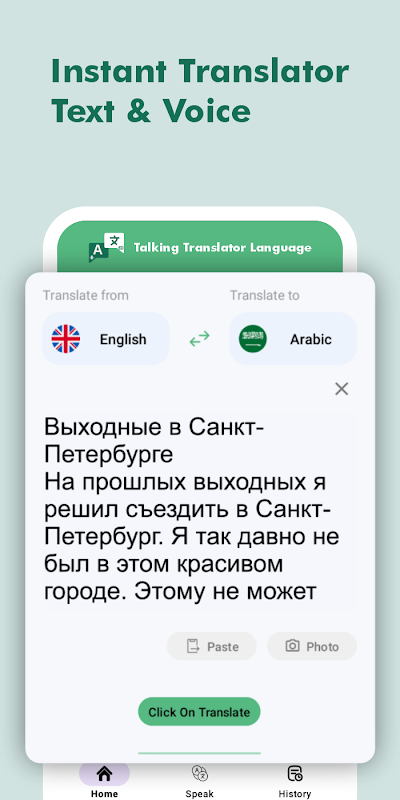 ٹاکنگ ٹرانسلیٹر لینگویج ایک ہمہ جہت ترجمہ ایپ ہے جو آپ کو آسانی کے ساتھ زبان کی رکاوٹوں کو توڑنے کی اجازت دیتی ہے۔ 100 سے زیادہ زبانوں کو سپورٹ کرتے ہوئے، یہ ہموار مواصلت کے لیے فوری آواز، متن، اور کیمرہ ترجمہ پیش کرتا ہے۔