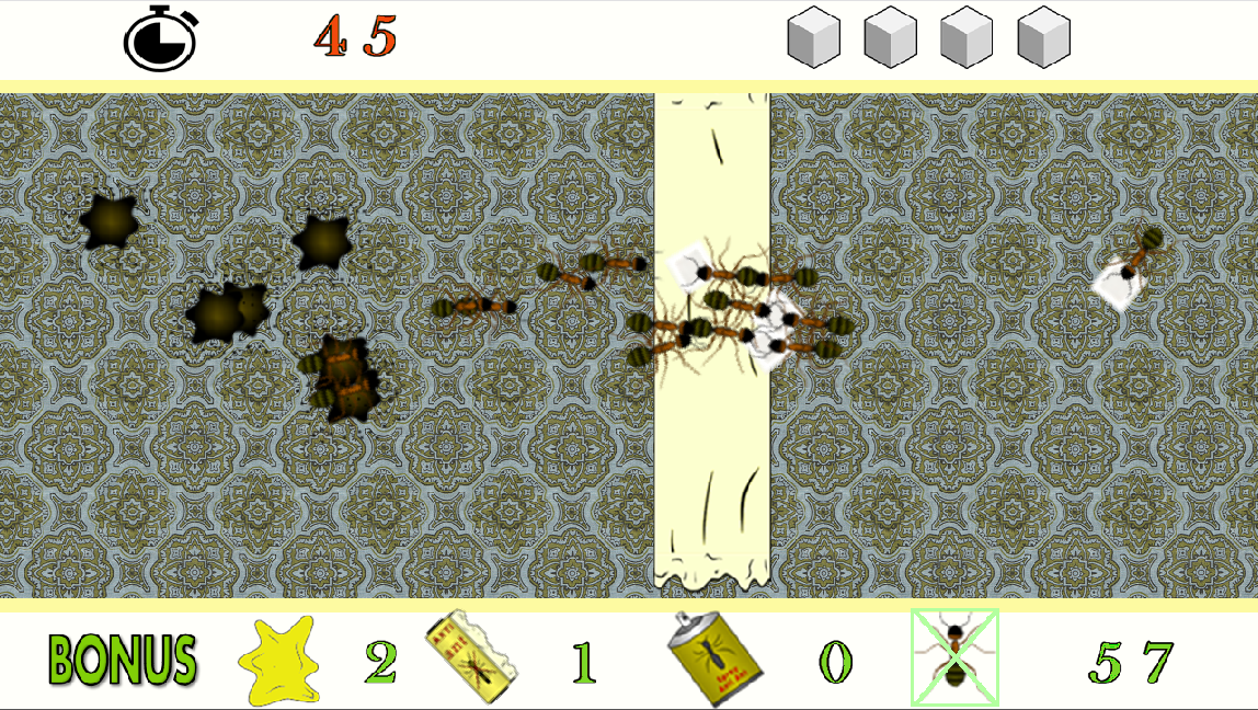 Points are awarded to the player for the time that he lasted and for the number of ants destroyed.