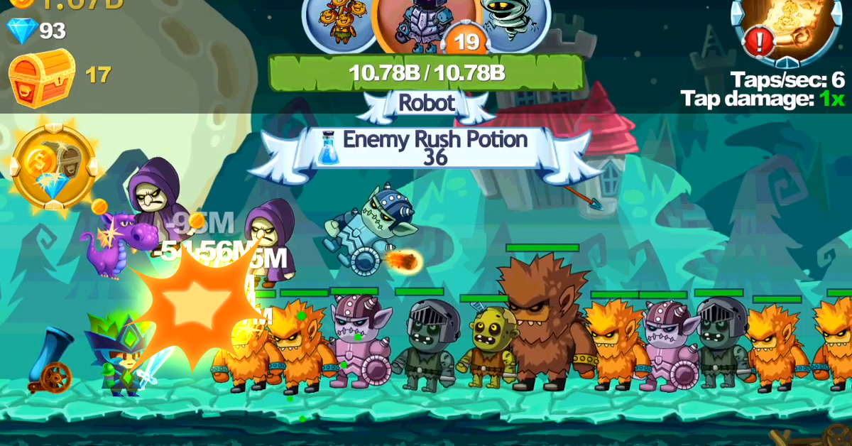 Tap Knight is an 'RPG clicker' game where the player slays monsters and gains experience to become powerful enough to free The Kingdom from evil Dark Mages. In this adventure there are many obstacles on the way, but also, there are lots of things to discover! Swords, chests, potions, artifacts, armor and trophies are waiting for their true hero to be unlocked!