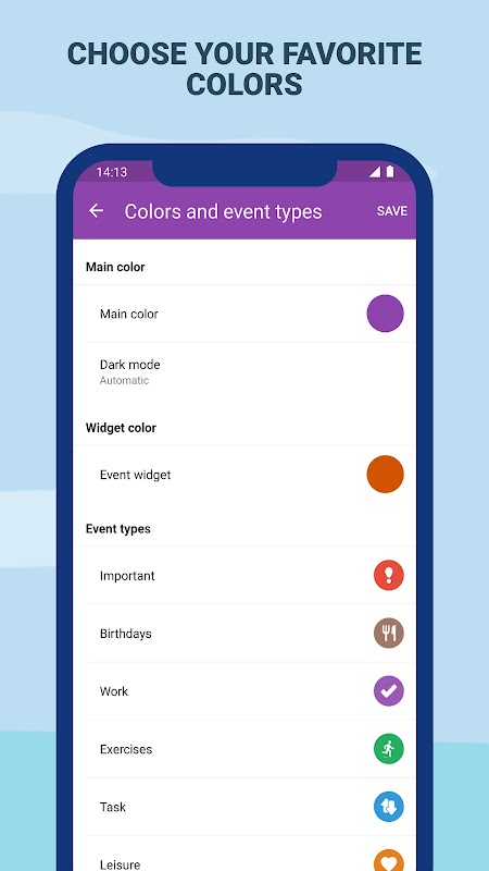 اپنے پسندیدہ رنگوں سے ایپ کو ذاتی بنائیں ، مرکزی رنگ ، ایونٹ کے رنگ (اہم ، کام ، یاد دہانی) اور ویجیٹ کا رنگ تبدیل کریں۔