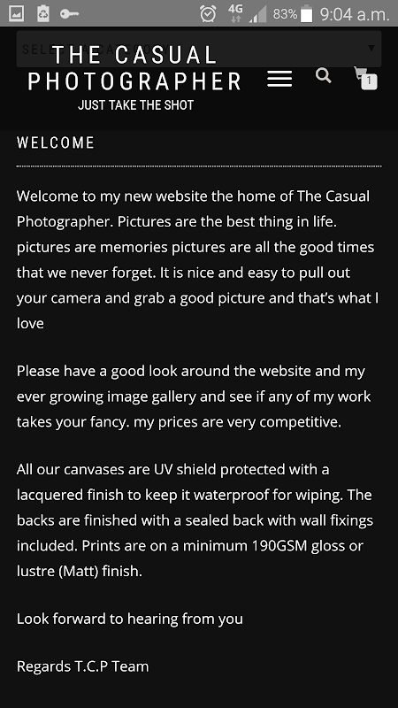 All our canvases are UV shield protected with a lacquered finish to keep it waterproof for wiping. The backs are finished with a sealed back with wall fixings included. Prints are on a minimum 190GSM gloss or lustre (Matt) finish.