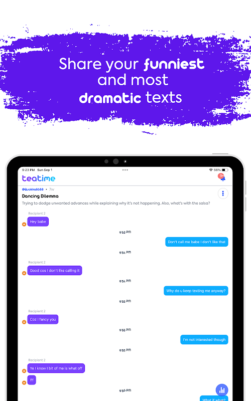 'بھیجیں' کو مارنے کے لئے جدوجہد کر رہے ہیں؟ ٹی ٹائم کے ساتھ اپنی تحریروں پر دوسری رائے حاصل کریں۔ ہماری ایپ حقیقی لوگوں سے تاثرات، ترامیم اور تجاویز فراہم کرتی ہے تاکہ آپ کو بہترین پیغام تیار کرنے میں مدد ملے۔ ریئل ٹائم ٹیکسٹ ڈرامہ میں غوطہ لگائیں، گمنام گفتگو کی پیروی کریں، اور اپنی بصیرت میں حصہ ڈالیں۔ چاہے آپ کو اعتماد بڑھانے کی ضرورت ہو یا الفاظ بنانے والے، ٹی ٹائم مدد کے لیے حاضر ہے۔ ہمارے بیٹا پروگرام میں شامل ہوں اور آج ہی اپنی بہترین تحریریں بنانا شروع کریں!