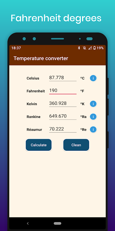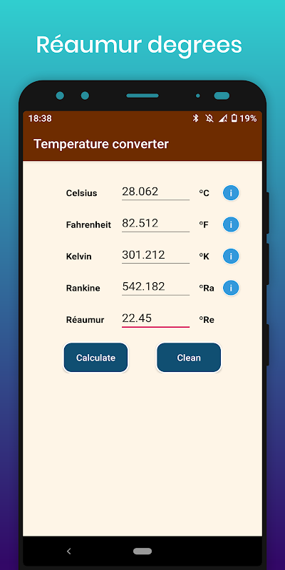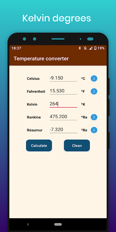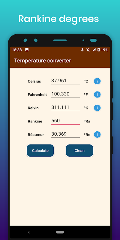 یہ طلباء یا پیشہ ور افراد کے لئے درجہ حرارت کا ایک مثالی کنورٹر ہے جسے پیمائش کے مختلف یونٹوں میں درجہ حرارت یا درجہ حرارت یونٹوں کے تبادلوں کا حساب لگانے کی ضرورت ہے۔