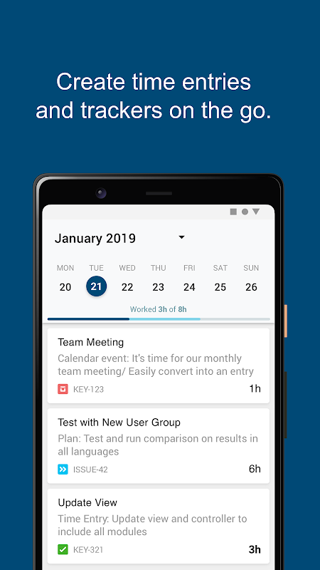 * میرے کام میں درست طریقے سے وقت لاگ ان کریں اور اپنے لاگ ان کام ، کاموں اور کیلنڈر کے ایونٹس کو دن ، ہفتوں ، یا ماہانہ نظارے کے ذریعہ براؤز کریں۔ آپ جہاں کہیں بھی ٹائم انٹریز اور ٹریکر تشکیل دے سکتے ہیں۔ معاملات کو تلاش کرنے ، وضاحتوں کو دوبارہ درج کرنے یا اندراجات تخلیق کرتے وقت دستی طور پر وقت داخل کرنے کی ضرورت نہیں ہے۔