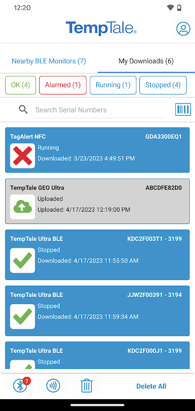 TempTale® GEO X، TempTale® BLE اور TagAlert® NFC مانیٹر کو چھ (6) درجہ حرارت کے الارم کے ساتھ پروگرام کیا جا سکتا ہے اور ایپ میں ڈسپلے کیا جا سکتا ہے۔ TempTale® GEO الٹرا الارم سافٹ ویئر میں دکھائے جاتے ہیں، کھیپ کے الارم کی حالت کی معلومات کی جانچ کرنے کے لیے ColdStream® سلیکٹ / SensiWatch® پلیٹ فارم پر لاگ ان ہوں۔