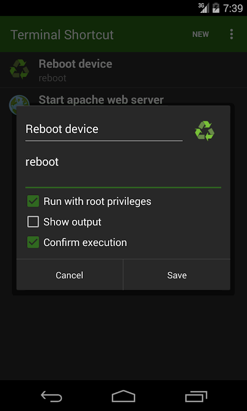 Some terminal commands have to be executed multiple times. If you do this in a terminal emulator, you need to type in the command by hand. With this app you can set a link (shortcut) to any terminal command which can be executed afterwards by pressing a button. If the command generates an output, it can easily be displayed if needed. Remote commands can be executed by using SSH. Commands can use SuperUser privileges.
