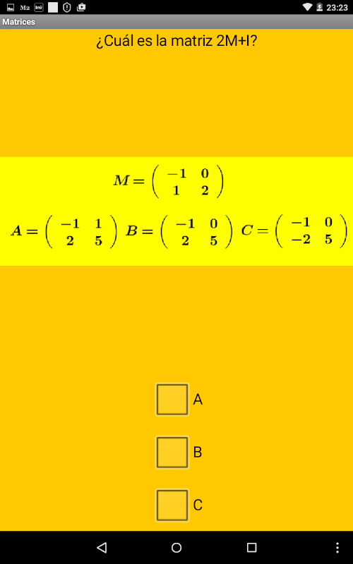 Aplicación tipo test de 20 preguntas sobre matrices, producto, suma, calculo de matrices inversas, rango de una matriz y grafos asociados.