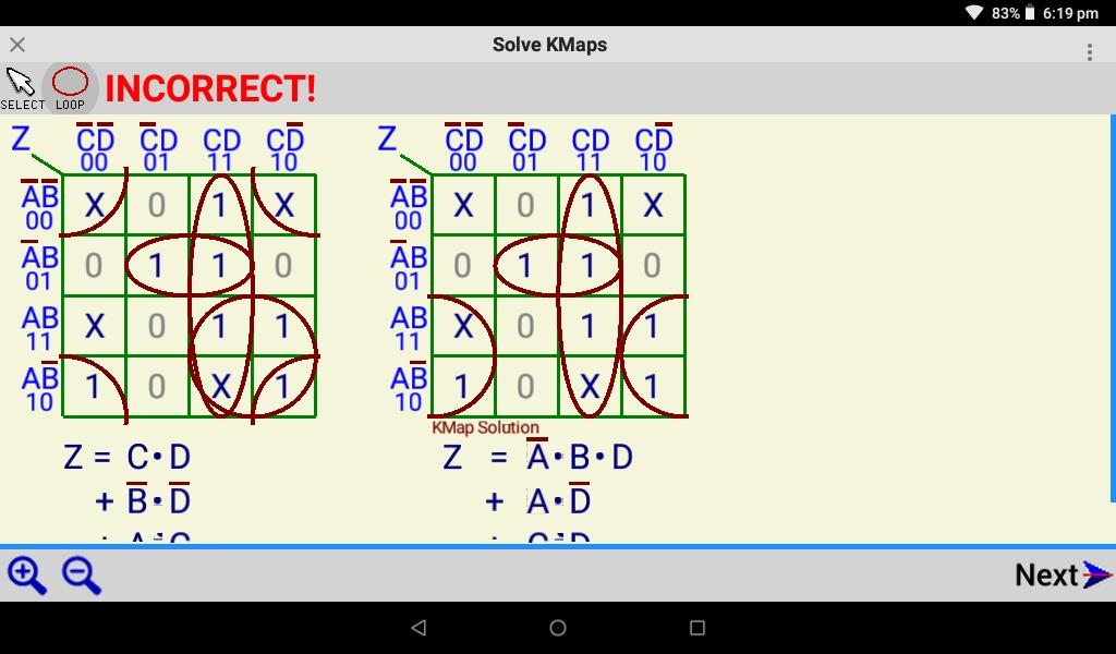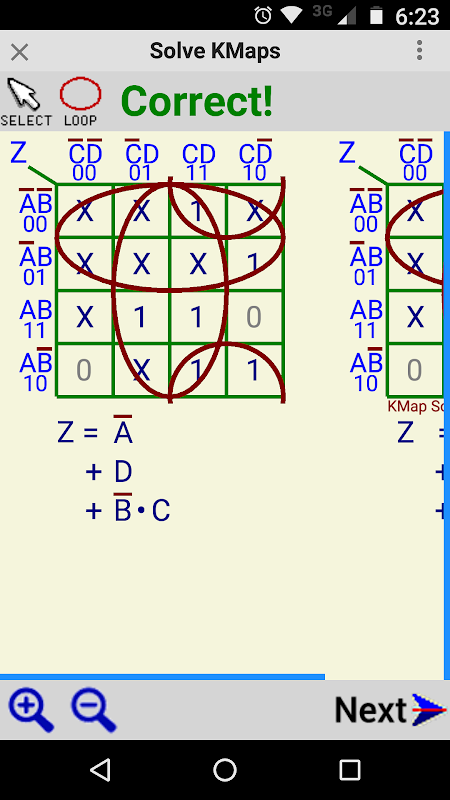 ایپلیکیشن ایک غیر حل شدہ KMap پیش کرتی ہے، جسے صارف لاجک ہائیز (1) اور / یا ڈونٹ پرواہ (X) کو لوپ کرکے حل کرتا ہے۔ ایک بار جب صارف KMap کو حل کرنا مکمل کر لے گا، CHECK بٹن حل کو چیک کرے گا، اور ایک درست یا غلط پیغام دے گا۔ اس کے بعد ایپلیکیشن صارف کے حل شدہ KMap کے ساتھ درست حل شدہ KMap بھی دکھاتی ہے۔ ایک آپشن صارف کو Karnaugh Map کے لیے تمام متعدد مساوی چھوٹے سے حل کو یکے بعد دیگرے منتخب کرنے کی اجازت دیتا ہے۔