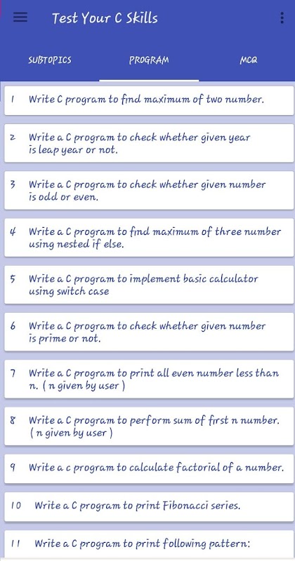 Test your C Skills is all in one application to learn C programming Language including theory, program with output, MCQ and GATE MCQ. You can easily learn C language using Test your C skills. You can Test your C language Skills. Test Your C Skills contain more than 100+ program as well as MCQ topic wise for C language. Test Your C Skills application also contain GATE MCQ that with improve your C language knowledge.