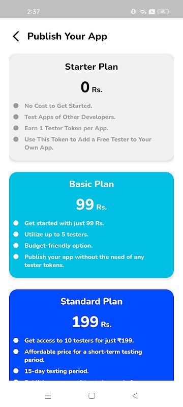 ان لوگوں کے لیے جو مزید ہموار تجربہ چاہتے ہیں، ہمارا بامعاوضہ منصوبہ حتمی سہولت فراہم کرتا ہے۔ اس اختیار کے ساتھ، آپ کو دیگر ایپس کی جانچ کرنے کی ضرورت نہیں ہے۔ بس اپنی ایپ کو جانچ کے لیے جمع کروائیں اور وہ تاثرات حاصل کریں جو آپ کو اپنی ایپ کو بہترین بنانے کے لیے درکار ہے۔