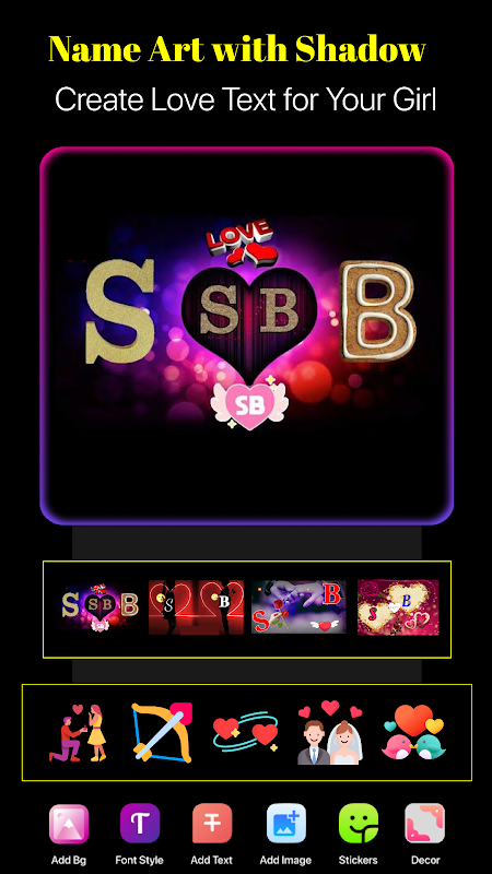 شیڈو ٹیکسٹ آرٹ میکر سے آپ اپنا پیار فونٹ، رنگ، ایڈٹ سائز ٹیکسٹ، ڈریگ، اپنے ٹیکسٹ کو گھما سکتے ہیں۔ اثر کا نام - آرٹ کہ آپ اسے مختلف آرائشی اشیاء سے سجا سکتے ہیں جیسے پنکھوں، ملکہ، بادشاہ کے تاج، رنگ برش، کلر فلٹر، دل کی شکلوں پرکشش متن کا رنگ اور اپنے نام کے آرٹ کے لیے گریڈینٹ۔