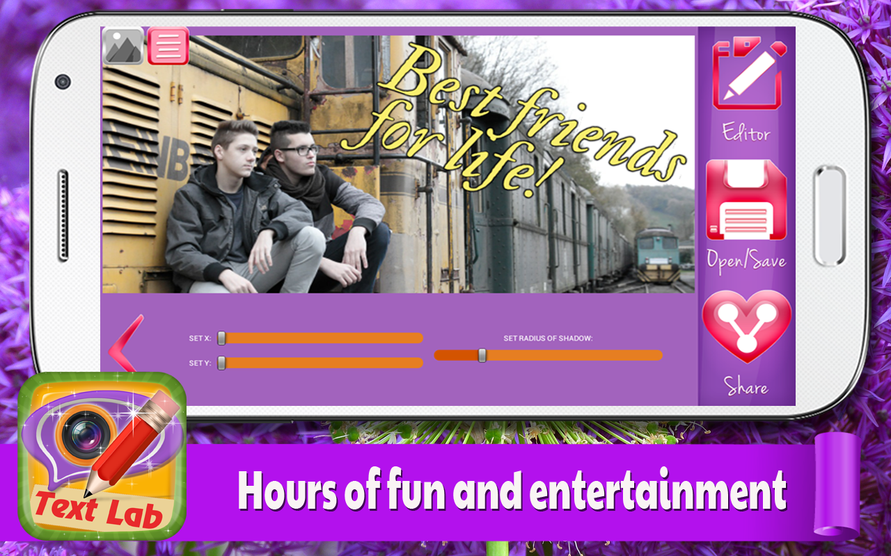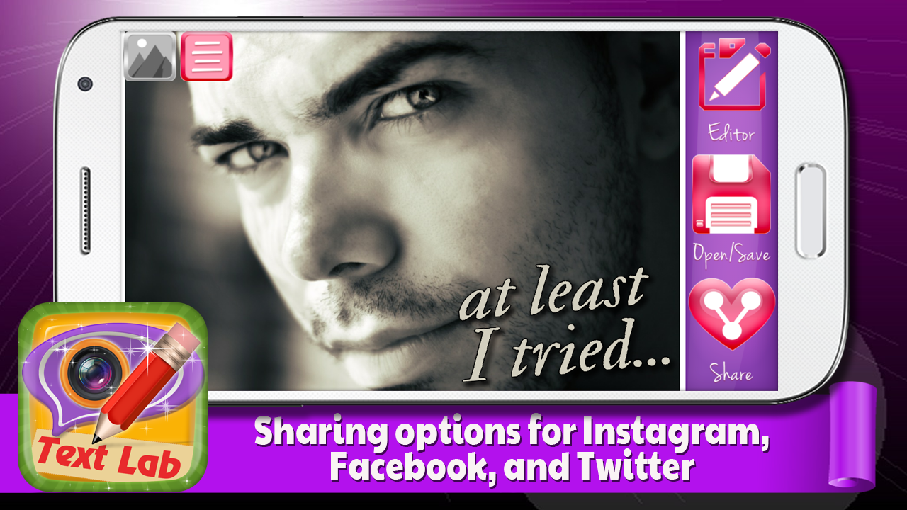 Photo editing mania rules the world and you've surely been affected by it! Let your selfies shine bright like a star on all social networks! Decorate your family pics in the loveliest manner! Beautify your love pictures and surprise your sweetheart with love greeting card! Photo editing options are numerous – all you have to do is download ➜ Text Lab – Write on Pics ➜ and let your imagination lead the way! Enjoy using this photo app!