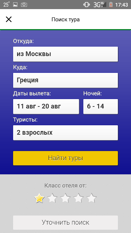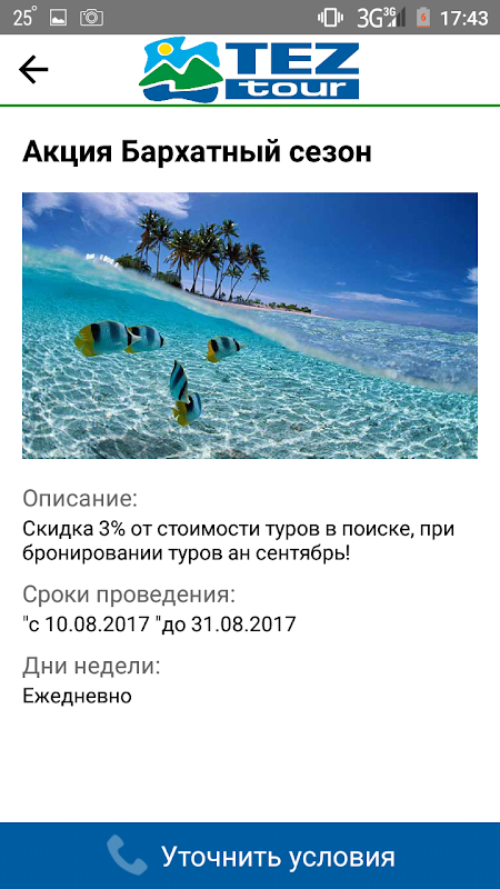 Приложение "TEZ TOUR - поиск туров" показывает актуальные цены оператора в режиме онлайн, но не является официальным приложением туроператора TEZ TOUR и не имеет отношении к сайту www.tez-tour.com Логотип и название используются на основании договора франшизы.
