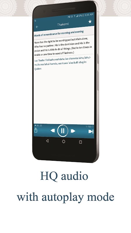 يمكنك التطبيق من المحافظة على الأذكار بشكل يومي حتى وإن لن تتمكن من قراءتها فمن خلال خاصية التشغيل التلقائي للأذكار يمكنك سماع الأذكار وترديدها في أي مكان بالسيارة أو بالطريق إلى العمل