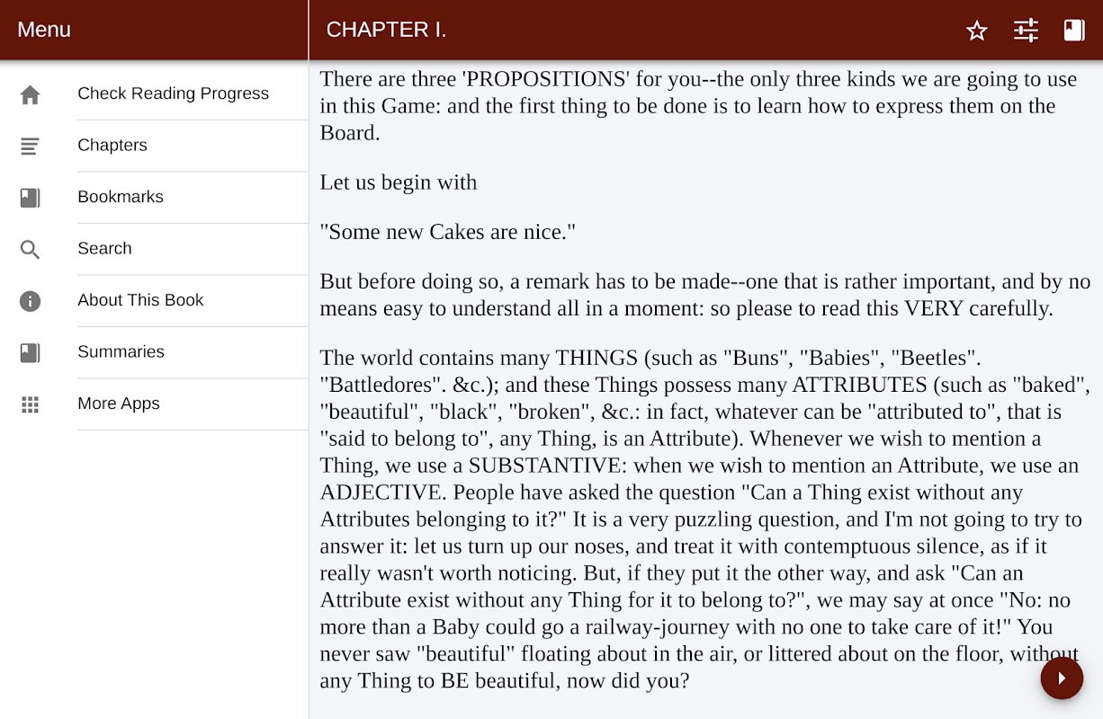 The Game of Logic, described by Lewis Carroll--author of Alice in Wonderland--in 1887 (Carroll 1972) consists of discussing the meaning of propositions like "Some fresh cakes are sweet," and is an instructive introduction to the concepts of logic.