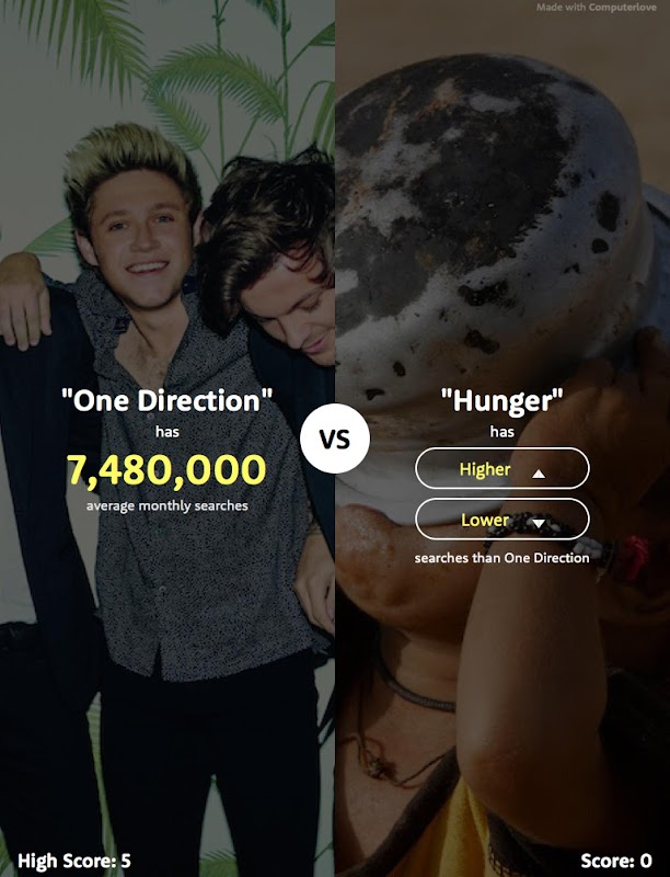 It’s easy to play, simply decide which search term has been searched for the most by selecting higher or lower. The objective is to get the most right in a row.