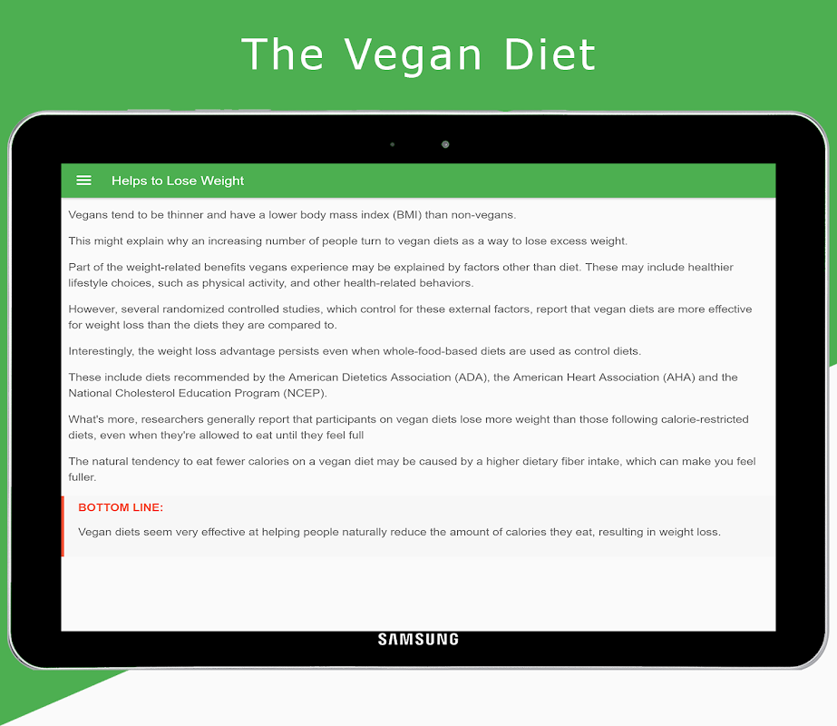 This app is a detailed beginner's guide to the vegan diet. It aims to cover everything you need to know, so you can follow a vegan diet the right way.