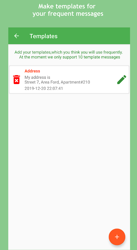 template آپ واٹس ایپ پر اکثر بھیجنے والے ٹیمپلیٹ پیغامات کو محفوظ کرسکتے ہیں۔ ان کو اس ایپ میں بطور ٹیمپلیٹس محفوظ کریں جو کسی کلک کے ساتھ کبھی بھی واٹس ایپ پر اشتراک کیا جاسکتا ہے۔ ٹیمپلیٹس آپ کے گوگل نقشہ جات ، آپ کے ڈاک کا پتہ ، یا آپ کے بینک اکاؤنٹ کی معلومات کا مقام ہوسکتے ہیں۔