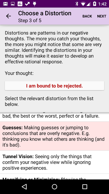 Thought Challenger helps you gain control of how you feel and what you do by teaching you to notice and challenge negative and unhelpful thoughts. Thought Challenger is built on cognitive behavioral therapy - a structure that has been found in clinical studies to be useful in examining negative thoughts and reframing them to help you feel better and do the things you want to do.