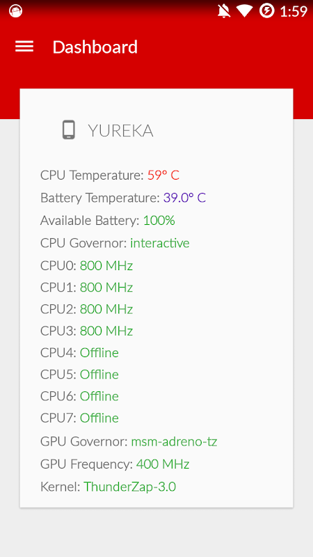 • CPU interface to let you control your device's CPU clocks and change it's various other parameters like governor, includes a live graph to show you how your CPU is being utilized.Additional support for Intelli-thermal