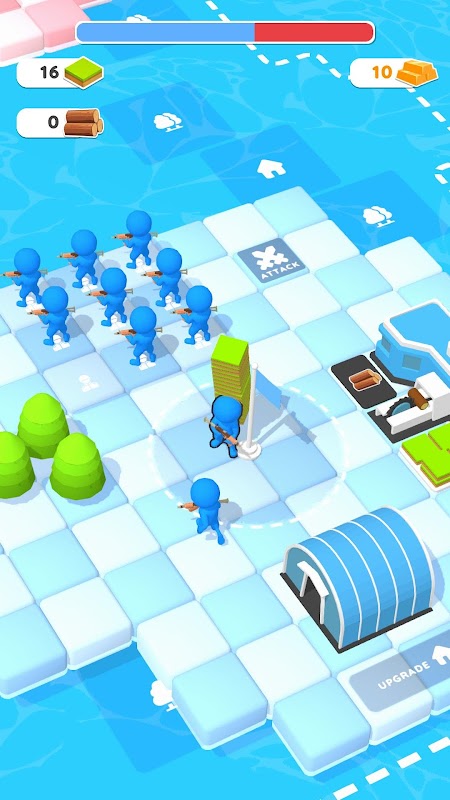 In this game you control the stickman commander with joystick. Your goal is to collect wood to creat tiles. Landing tiles on the water you will unlock new buildings and the puth to your enemy base. Build an army and controll all positions by raising the flag.