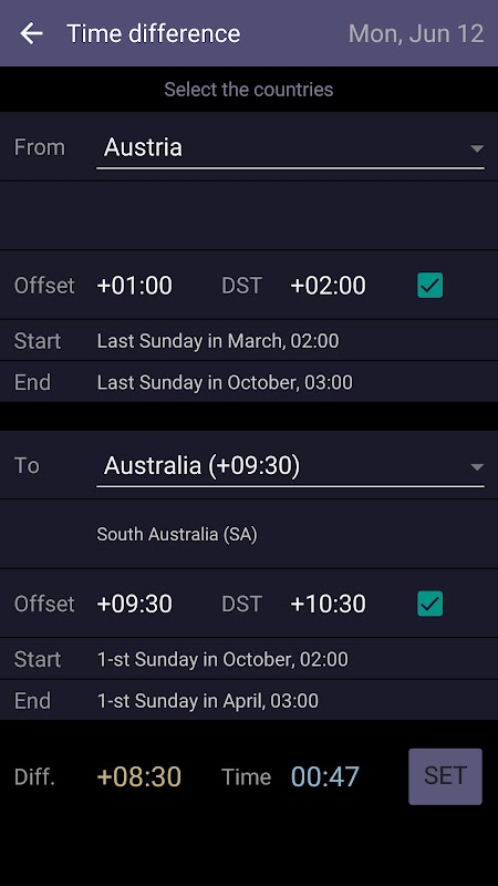 - پہلا صفحہ (بائیں بٹن کو تھپتھپائیں) پوری دنیا کا ایک اعلی ریزولوشن نقشہ رکھتا ہے، ہر ٹائم زون کی شکل دکھاتا ہے۔ آپ کسی بھی علاقے کے لیے آفسیٹ کا وقت معلوم کرنے کے لیے پین، زوم ان، یا زوم آؤٹ کر سکتے ہیں۔ دو ممالک کے درمیان وقت کے فرق کا حساب لگانے کے لیے '+' بٹن کو تھپتھپائیں۔ پہلے اور دوسرے ملک کا انتخاب کریں، پھر اگر لاگو ہوتا ہے تو DST (ڈے لائٹ سیونگ ٹائم) چیک باکسز کو منتخب کریں۔ نیا مقامی وقت دستی طور پر سیٹ کیا جا سکتا ہے، یہ آپریشن بہت مفید ہے جب انٹرنیٹ اور مقام کی خدمات دستیاب نہ ہوں۔