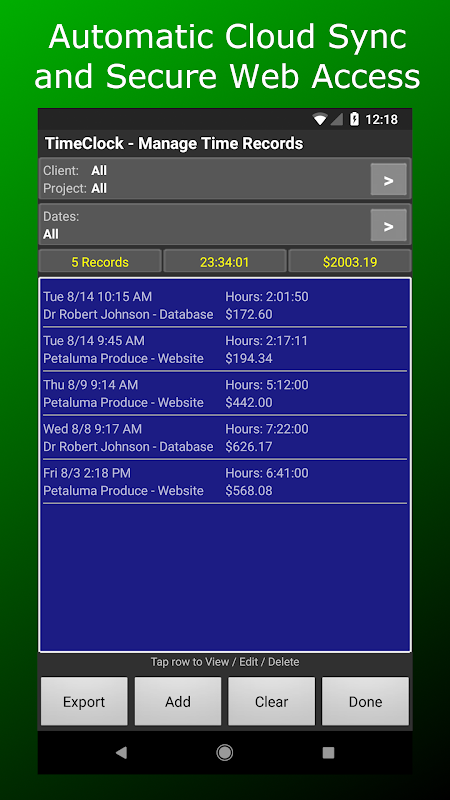 * View and edit all time records within the app. You can go back and change the start and end times, billing rate, notes - any field can be edited.