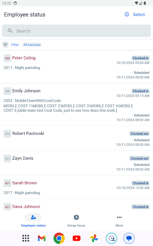 بڑے پیمانے پر کلاک آپریشنز: وقت کی بچت کریں اور صرف چند نلکوں کے ساتھ بڑی تعداد میں کارروائیوں کو انجام دے کر اپنے ورک فلو کو آسان بنائیں۔ بغیر کسی پریشانی کے بڑے پیمانے پر کلاک ان، کلاک آؤٹ، وقفے کا انتظام، اور نوکری یا لاگت کے کوڈز کو آسانی سے انجام دیں۔