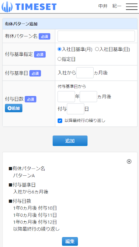 有休パターンを登録することで、従業員に応じた有休パターンを割り振り、有休自動付与が可能です。
