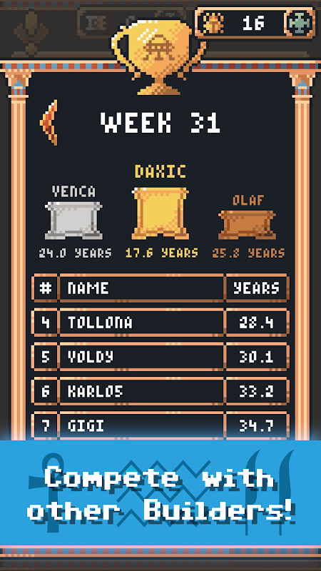اپنے نتائج کا آن لائن لیڈر بورڈ پر موجود دیگر کھلاڑیوں سے موازنہ کریں اور پورے مصر میں تیز ترین بلڈر بنیں!