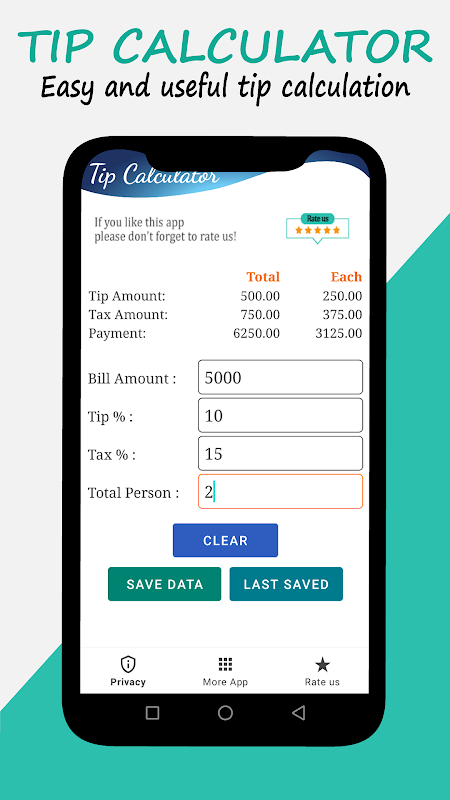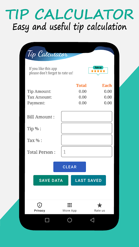 TIP کیلکولیٹر ایپ کے ساتھ، آپ آسانی سے اپنے بل کی کل اور مطلوبہ ٹپ فیصد کی بنیاد پر مناسب ٹپ کی رقم کا حساب لگا سکتے ہیں۔ آپ بل کو متعدد لوگوں میں تقسیم بھی کر سکتے ہیں، جس سے آپ کے کل بل کی لاگت کو دوستوں کے ساتھ بانٹنا آسان ہو جاتا ہے۔ صرف بل کی کل رقم درج کریں، مطلوبہ ٹپ فیصد، اور مطلوبہ ٹیکس فیصد منتخب کریں، اور پھر منتخب کریں کہ کتنے لوگ بل تقسیم کریں گے۔ اس کے بعد ایپ خود بخود مناسب رقم کا حساب لگائے گی جس میں ہر فرد کو حصہ ڈالنا چاہیے، بشمول ٹپ۔