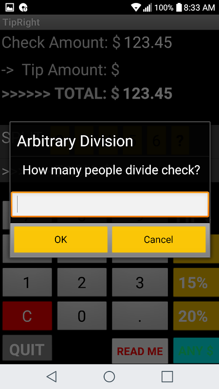 - Buttons for split of total bill from two to six people plus an additional botton that will display a field for an arbitrary group.