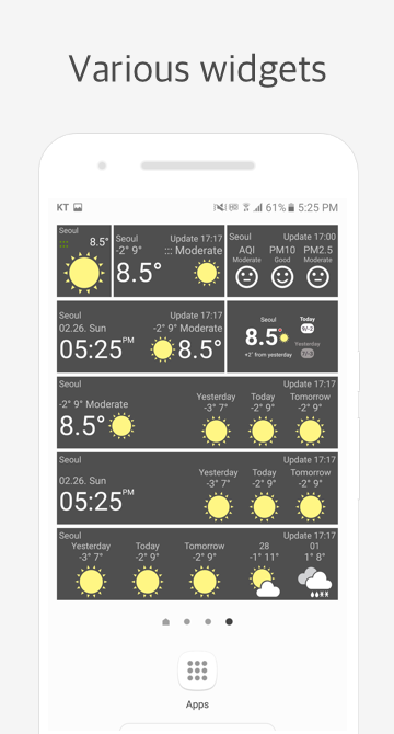 The app provides a variety of widgets such as ‘Current Weather’ Widget, ‘Pollution Particles Alert’ Widget, ‘Daily Weather’ Widget, ‘Clock/Weather(Yesterday-Today-Tomorrow)’ Widget,