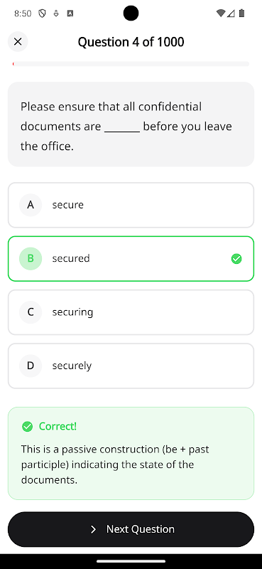فوری سیکھنا: صرف صحیح جواب نہ دیکھیں — یہ سمجھیں کہ یہ صحیح کیوں ہے۔ آپ کے گرامر کی منطق کو بہتر بنانے کے لیے ہر سوال میں ایک تفصیلی وضاحت شامل ہے۔