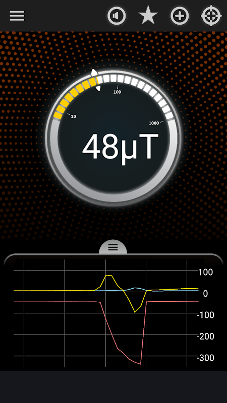 Metal Detector is an application which detects the presence of metal nearby by measuring the magnetic field value. This useful tool uses the magnetic sensor built-in your mobile device and shows magnetic field level in μT (microtesla). The magnetic field level (EMF) in nature is about 49μT(micro tesla) or 490mG(milli gauss); 1μT = 10mG. If any metal is near, the value of magnetic field will increase.