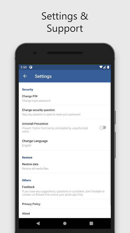 اس ایپ کو فلیش لائٹ ایپ کے طور پر بھیس دیا گیا ہے، جسے LED لائٹ کو آن/آف کرنے کے لیے استعمال کیا جا سکتا ہے۔ لیکن اگر آپ ٹارچ ٹائٹل کو دیر تک دبائیں گے تو اصلی والٹ کھل جائے گا اور آپ اپنی پسند کی تصاویر، ویڈیوز اور تمام قسم کی فائلوں کو چھپا سکتے ہیں۔