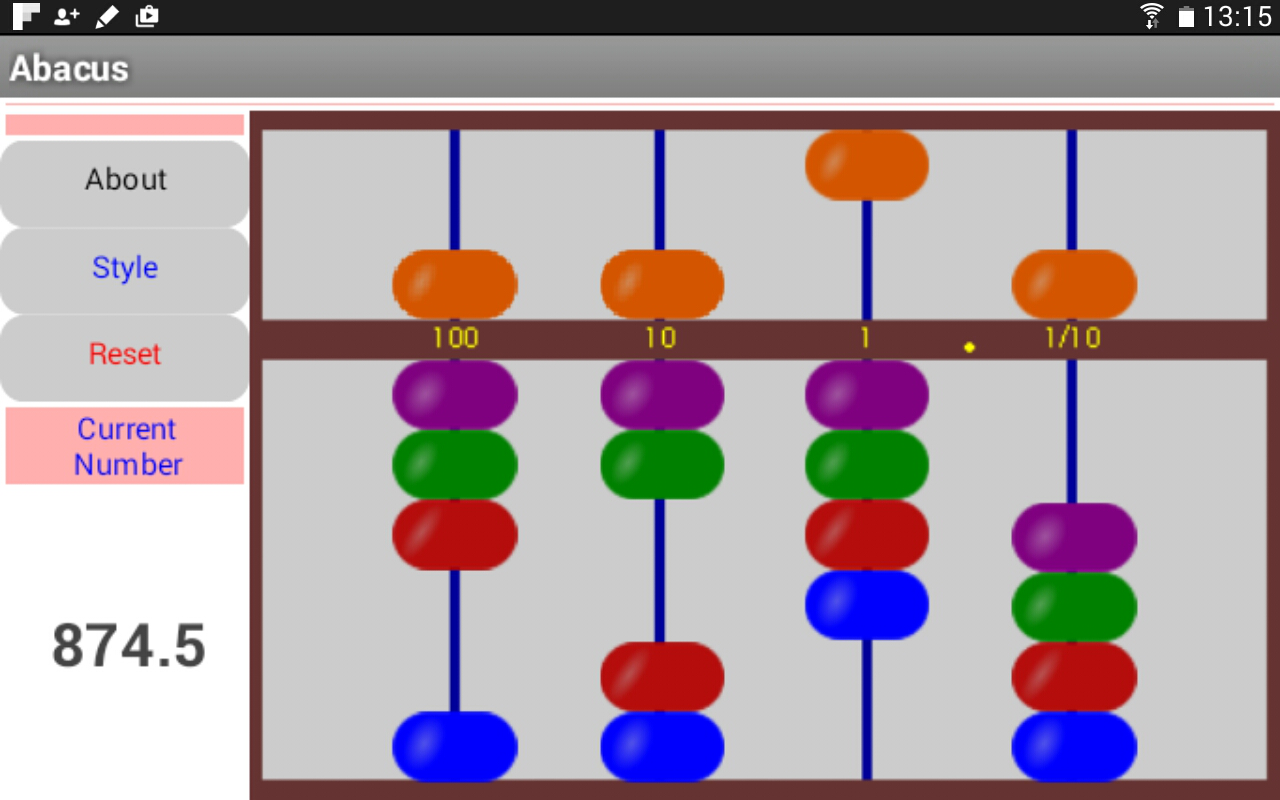 A simple Touch Abacus aimed for the development of number sense in early math learning. The abacus has a long history in various cultures and is both concrete and abstract in some sense. This app provides the Chinese and Japanese versions. The Chinese abacus has seven beads on a vertical bar, while the Japanese version has five beads on a vertical bar. As a general rule, each bead in the lower deck represents one when moved toward to center beam. Each bead in the upper deck represents five when moved to the center beam. On the Japanese abacus, each bar could represent zero to nine units. By contrast, the Chinese abacus allows the representation of zero through 15 units on each bar, thus supporting calculation using the base-16 system. For the base-10 system, the two beads at the very top and bottom are not used. About the decimal point, users could, in fact, choose their own place, depending on their specific needs. This abacus app is developed by Dr. Lingguo Bu (