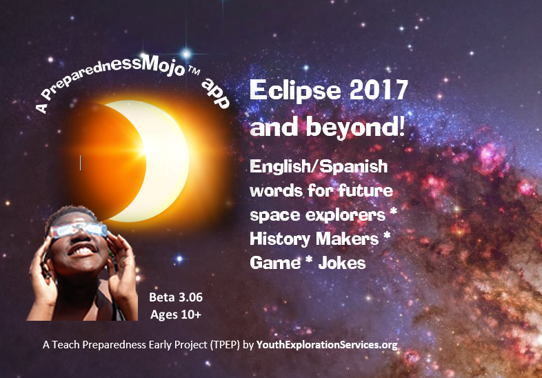(1) 40 words for future space explorers in English and Spanish with pronunciations, (2) African American contributors to space sciences and astronomy, (3) Gamebot, (4) Public Service Announcement about Eclipse viewing safety. (5) Resource links to learn more about the topic.