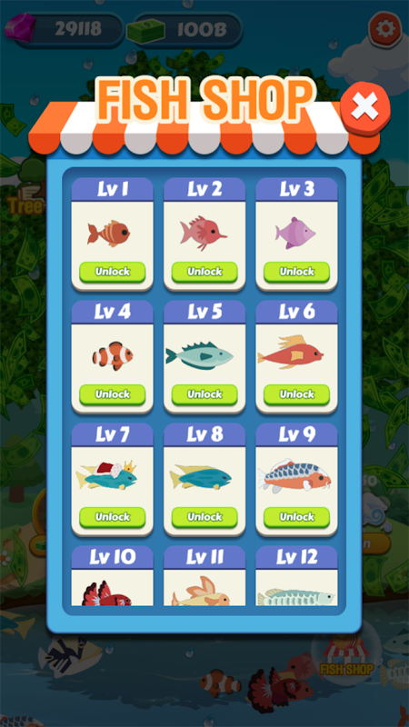 درخت پر کلک کریں اور مچھلی کو غیر مقفل کریں