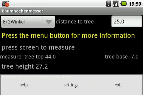 اس ایپ کے ذریعہ ، جنگل میں درخت کی اونچائیاں ماپا جاسکتی ہیں یا اندازہ لگایا جاسکتا ہے۔ آپ کی پیمائش کا معیار اس بات پر منحصر ہے کہ آپ کے android کا انکلوومیٹر کتنا اچھا ہے اور آپ آلہ کو کتنا خاموش کرسکتے ہیں۔ تاہم ، درخت کی اونچائی کی پیمائش کے معیار کا موازنہ اونچائی پیمائش والے آلے سے نہیں کیا جاسکتا۔ لہذا یہ ایپ درخت کی اونچائیوں کا تیزی سے تخمینہ لگانے کے ایک آلے کے طور پر تیار کی گئی ہے۔ جنگل کے طلبا کو اونچائی کی پیمائش کے طریقہ کار کی وضاحت کرنا بھی ہے۔
