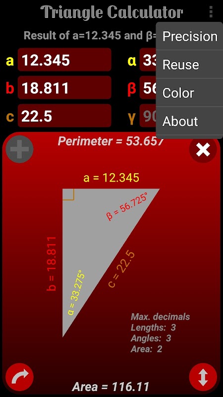 سہ رخی کے ذریعہ ، لمبائی اور زاویوں کا حساب دائیں کونے والے مثلث کے ل for کیا جاتا ہے جب صرف دو اقدار معلوم ہوں (کم از کم ایک لمبائی ہونی چاہئے)۔ مثلث کا رقبہ اور دائرہ بھی حساب لیا جاتا ہے۔