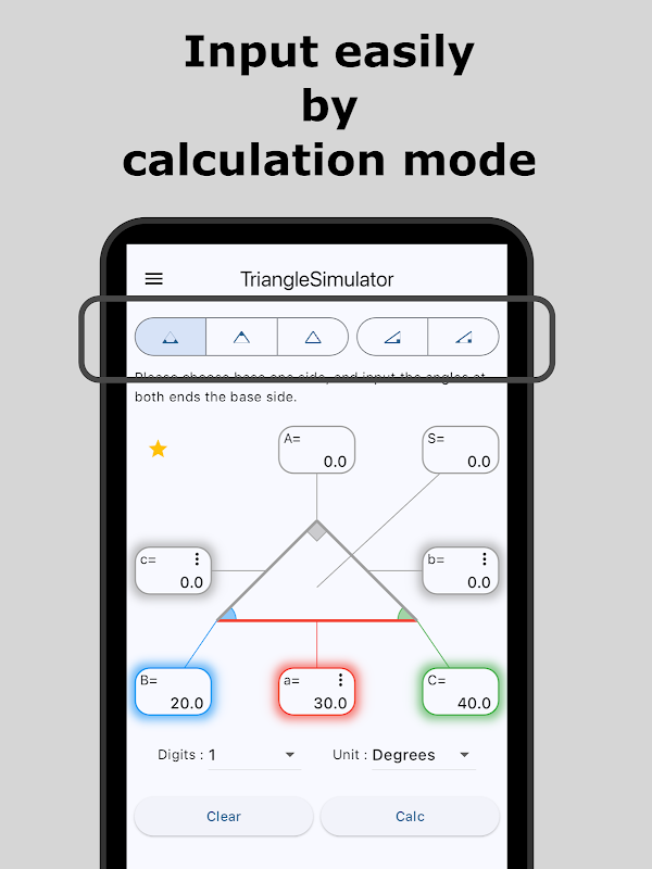 - آپ مثلث کیلکولیشن موڈ کے ذریعہ آسانی سے اطراف اور زاویوں کو ان پٹ کرسکتے ہیں۔