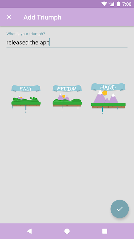 And that's it. Triumphs is that simple. It does a lot for you with minimum features to minimize feeling overwhelmed or confused. You're not required to do complex or even simple organizing, something which can easily cause stress in itself. Don't give up, everyone can find their triumphant self and learn to celebrate themselves and their lives.