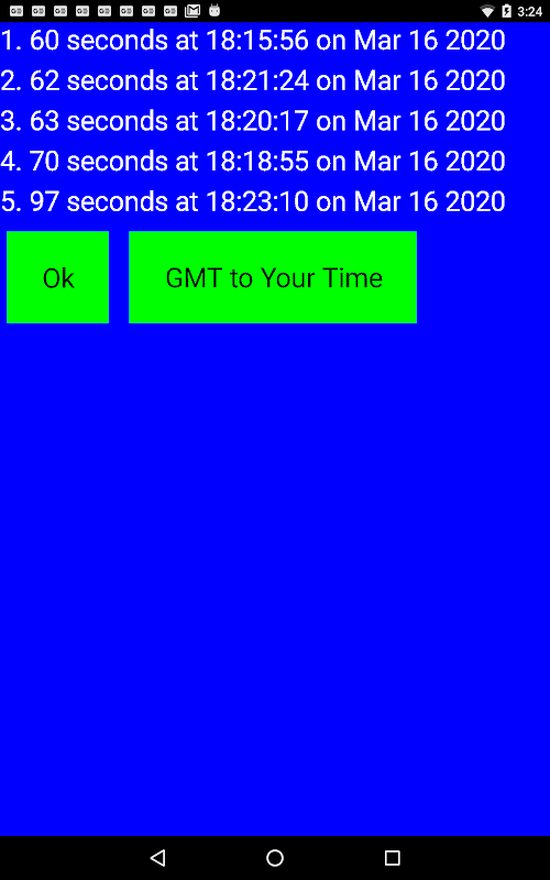 اپنے ٹاپ 5 بار اور آخری گیم سے اپنا وقت دکھانے کے لیے ٹائمر کو ٹچ کریں۔ اپنا مقامی وقت سیٹ کرنے کے لیے "GMT ٹو یور ٹائم" بٹن کو ٹچ کریں۔ گیم پر واپس آنے کے لیے "ٹھیک ہے" کو ٹچ کریں۔