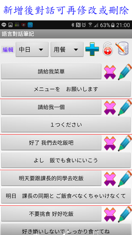 App設定為語言對話筆記,可新增、修改、刪除.類別亦可新增、修改、刪除 對話共有中日、中英、英日、中韓、中法、中西、中德、中俄、中義九組. 一組或二組或全部出現