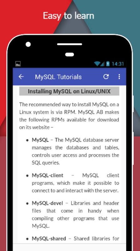 Tutorials for MySQL Offline is a complete application for those of you who want to learn MySQL easily and for free. There are dozens and even hundreds of MySQL tutorials starting to base for beginners to advanced. All these tutorials you can read offline without the need to connect to the internet or mobile data.
