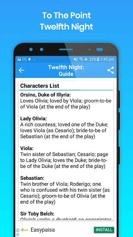 This Guide app works both online and offline, and contains 23 basic topics about one of the famous plays of William Shakespeare, Twelfth Night.