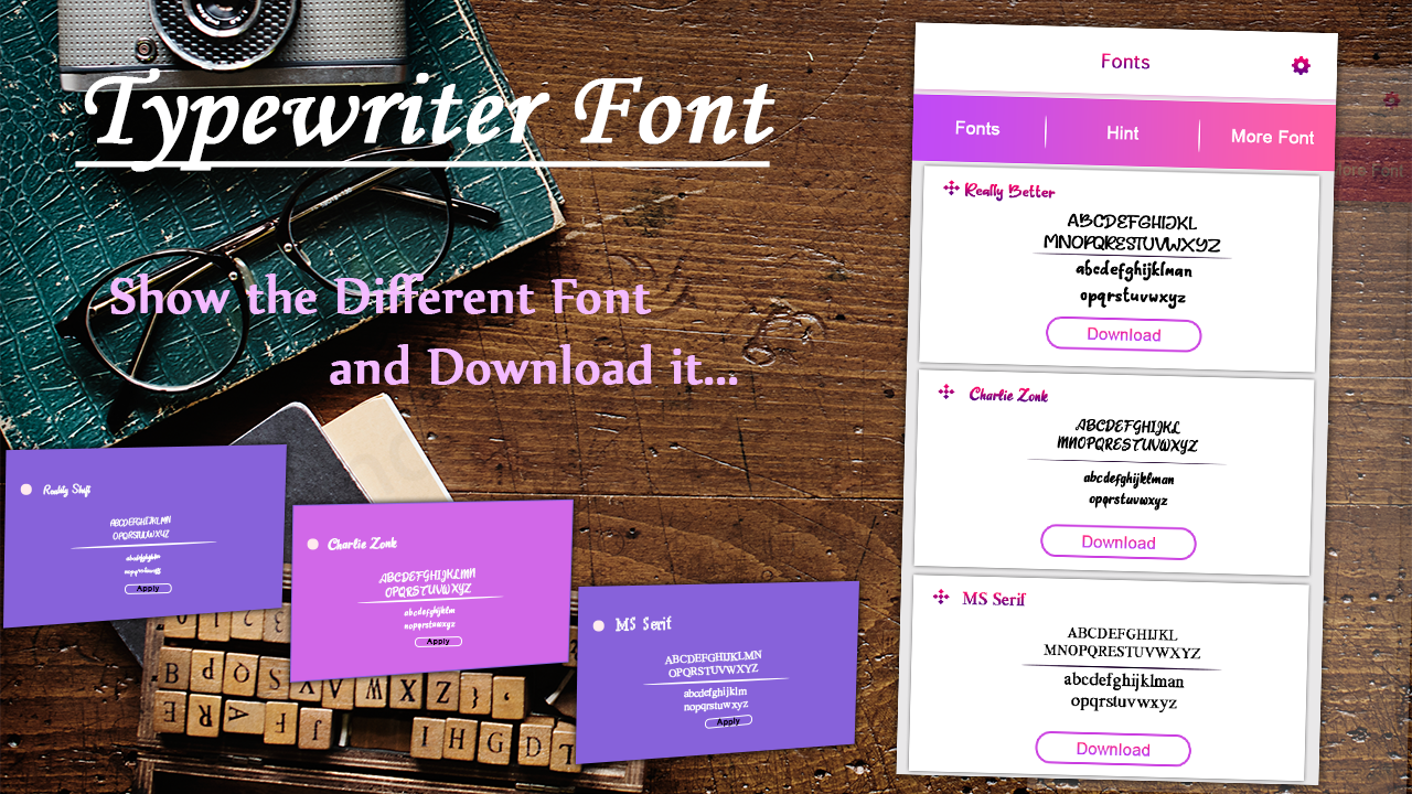Use our smart Typewriter Free Font Style application which is allows users to get one or more Font Style in your mobile for free. Application which allows users to see instant preview about fonts and then apply on device. Quick settings to change your font directly fast within some seconds. Get Typewriter Fonts with Large collection and best way to change the stylish look to Android Phone with attractive Fonts.