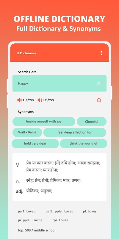 This U Dictionary - Offline Dictionary app has lakhs of English and Hindi words. It helps in building your vocabulary by daily words meaning, word of the day alerts, and word of the day videos. You can find words and track them for learning.