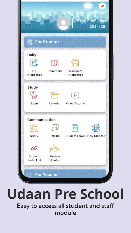 اڑان پری اسکول اینڈرائیڈ ایپ ان کے طلباء، والدین اور اساتذہ کے لیے انسٹی ٹیوٹ کی معلومات دیکھنے اور ڈاؤن لوڈ کرنے کے لیے۔